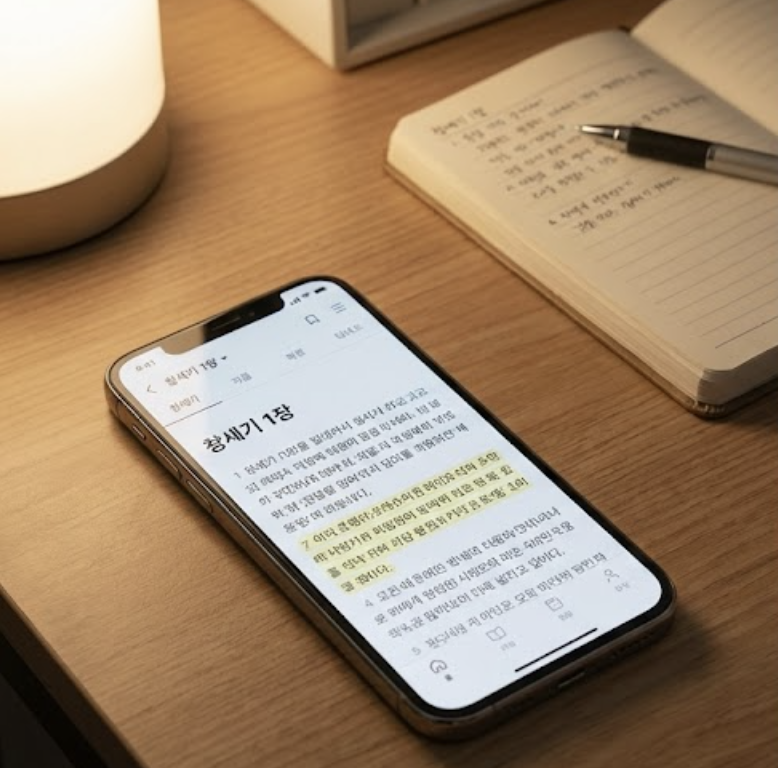 • 대중교통 이용 시: 스마트폰으로 갓피아 앱을 열어 성경을 읽거나, 이어폰을 끼고 오디오 성경을 듣습니다. 이해가 어려운 단어는 즉시 사전 기능을 활용하여 찾아봅니다.