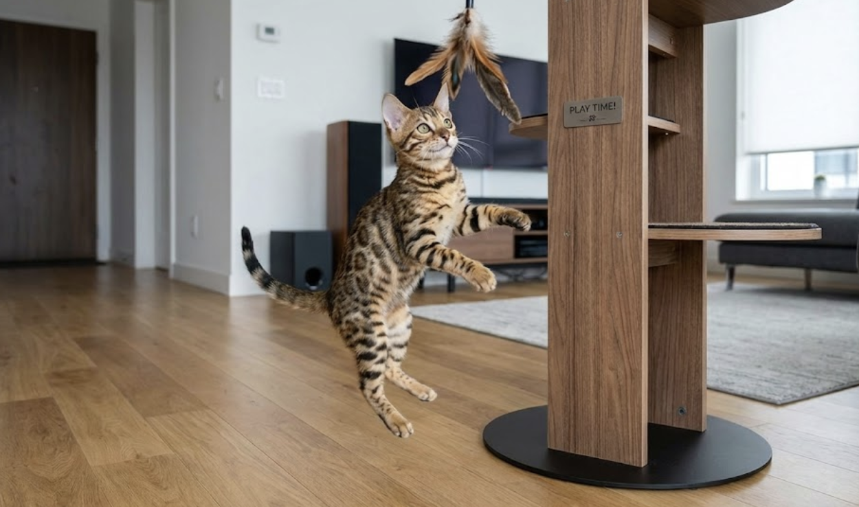 A5. 뱅갈 고양이는 사냥 본능이 강하고 활동량이 많으므로, 낚싯대 장난감이나 레이저 포인터(과도한 사용은 스트레스 유발 가능), 숨바꼭질, 공놀이 등 움직임을 유발하는 놀이를 좋아합니다. 높은 곳을 오르내릴 수 있는 캣타워나 캣휠을 설치해주는 것도 좋습니다. 지능이 높아 퍼즐 장난감이나 간식을 숨겨 찾는 놀이도 즐깁니다.