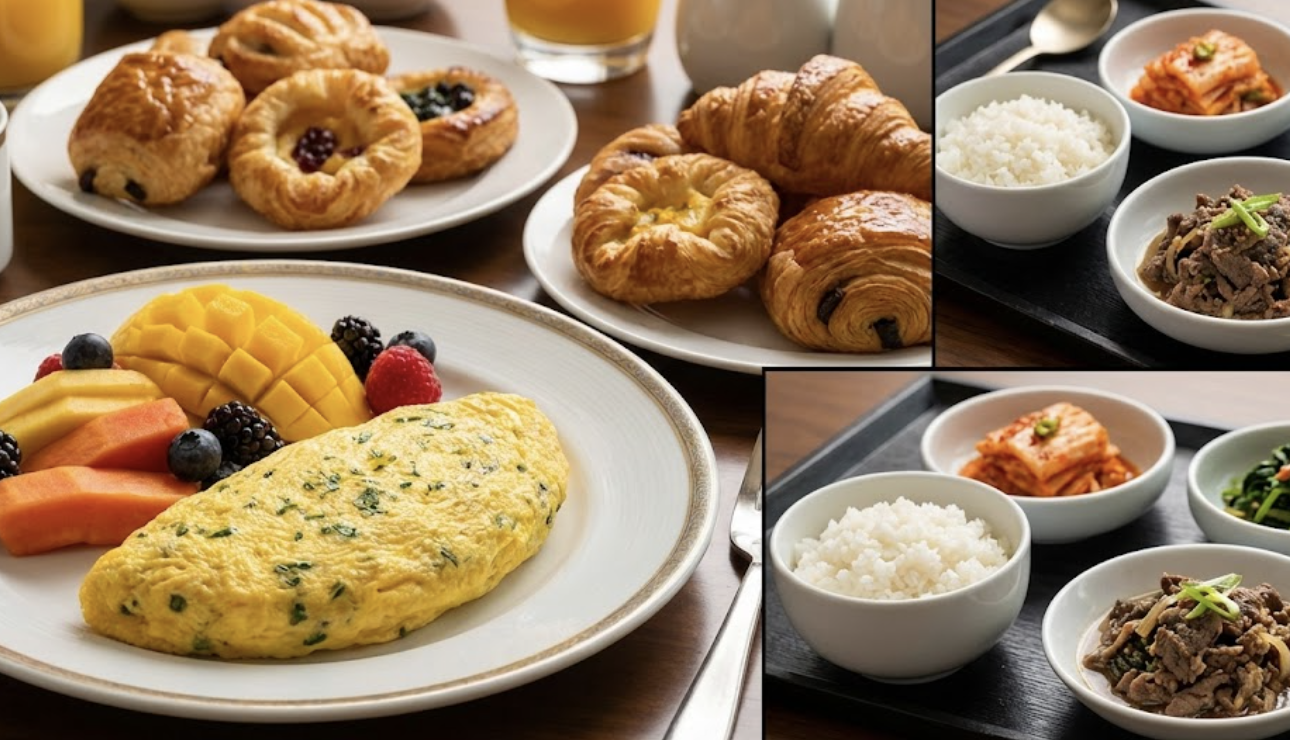 한식 코너: 한국인 투숙객을 위해 밥, 국, 김치, 불고기, 나물 등 기본적인 한식 메뉴가 준비되어 있습니다. 해외에서도 익숙한 맛으로 든든한 아침을 시작할 수 있습니다.