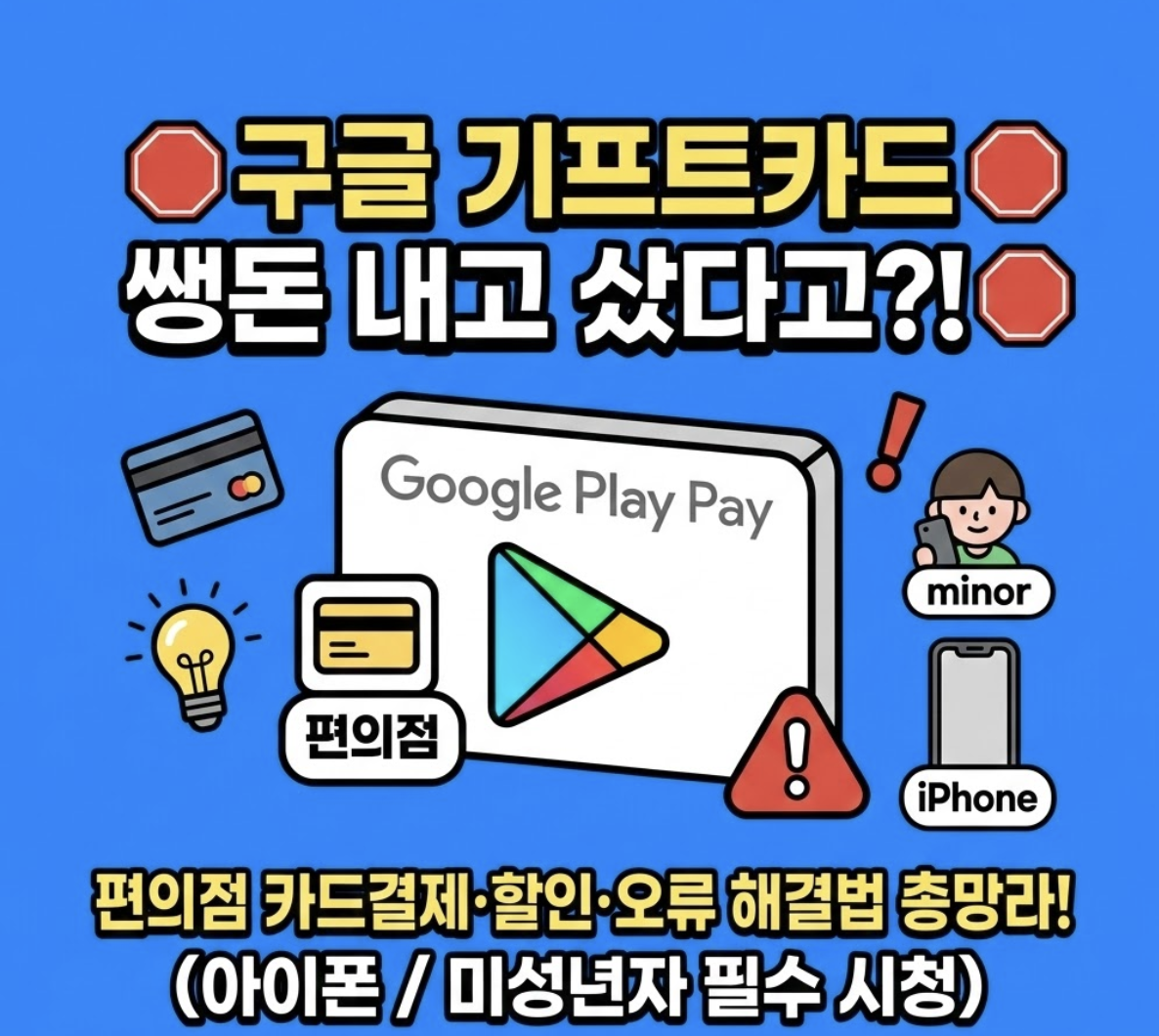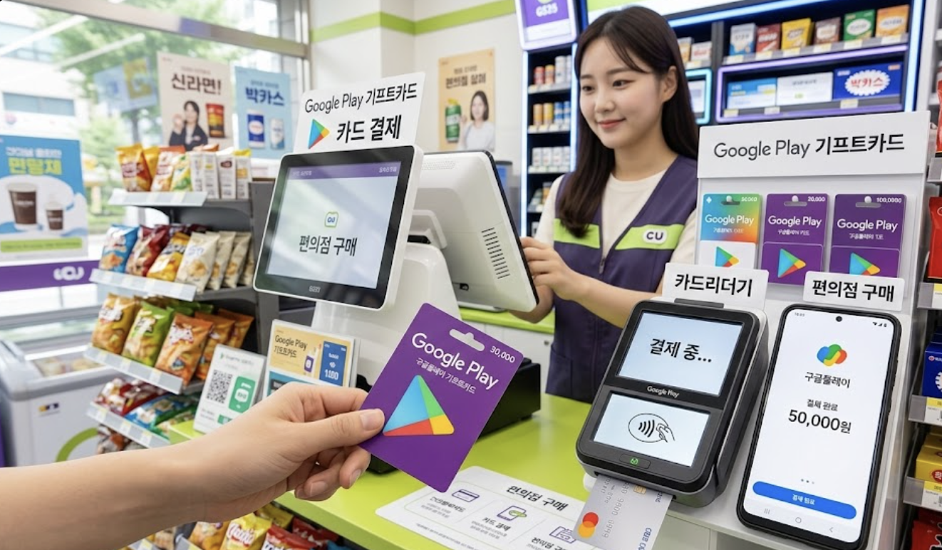 가장 흔하고 접근하기 쉬운 방법은 가까운 편의점에서 직접 구매하는 것입니다. GS25, CU, 세븐일레븐, 이마트24 등 전국 대부분의 편의점에서 Google Play 기프트카드를 판매하고 있습니다.