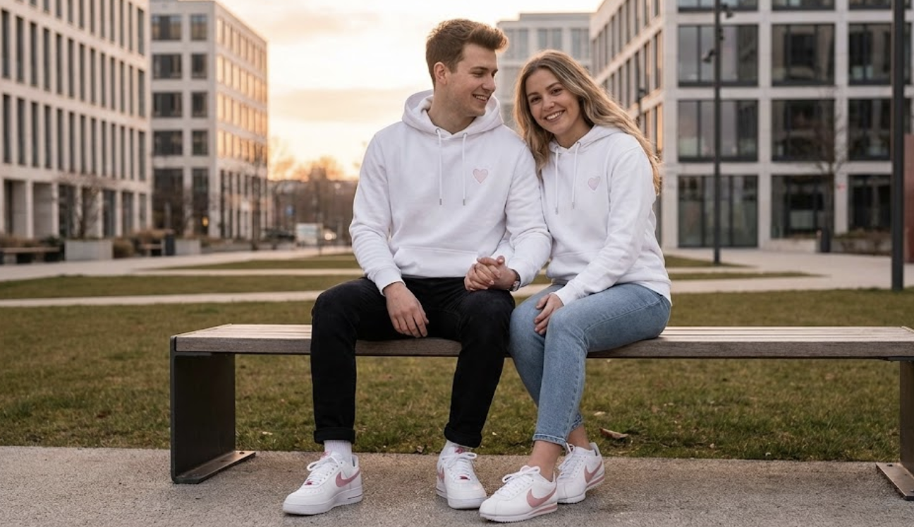 “커플 룩으로 활용할 때는 꼭 같은 디자인의 신발이나 옷을 입을 필요는 없습니다. 예를 들어, 한 사람은 발렌타인 에어포스 1을, 다른 한 사람은 발렌타인 코르테즈를 신고, 후드티는 같은 디자인이지만 다른 컬러를 선택하는 식으로 변화를 주면 더욱 센스 있는 커플 룩을 완성할 수 있습니다. 비슷한 컬러 팔레트나 하트 모티프를 공유하는 것으로도 충분히 통일감을 줄 수 있습니다.”