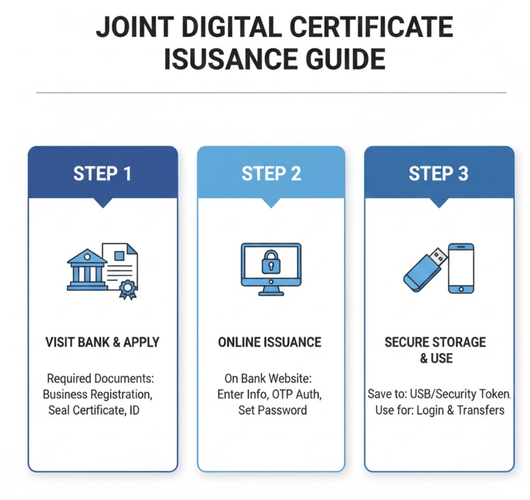 • 범용 기업 공동인증서: 모든 금융기관 및 정부기관에서 사용 가능한 인증서입니다. 발급 비용이 발생합니다.
