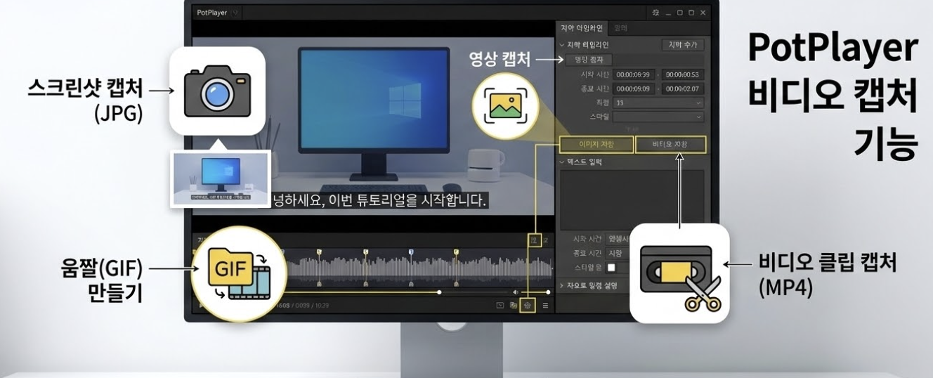 팟플레이어는 영상 재생뿐만 아니라, 원하는 장면을 이미지나 동영상으로 캡쳐하는 강력한 기능을 내장하고 있습니다. 강의 자료 제작, 영화 명장면 저장, 짧은 영상 클립 공유 등 다양한 상황에서 유용하게 활용될 수 있습니다.