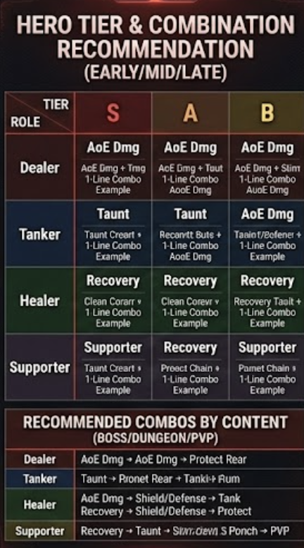 - 던전/스테이지: 광역 피해 영웅이나 생존력을 높여주는 영웅들이 유용합니다.
