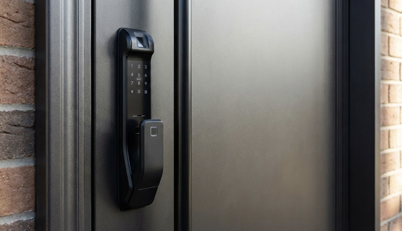 스마트 도어락 연동 현관문 스마트 도어락 시스템이 기본적으로 장착되거나 연동이 용이하도록 설계된 현관문입니다. 지문 인식, 카드 키, 스마트폰 앱 제어 등 편리하고 안전한 기능을 제공합니다.