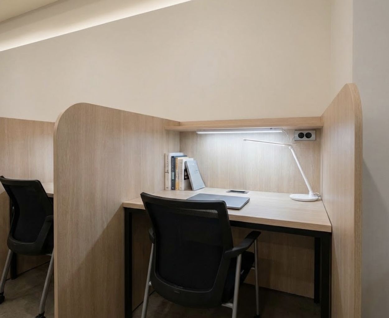 이러한 1인실 칸막이 책상에는 보통 개인 스탠드, 콘센트, USB 충전 포트, 작은 수납공간 등이 기본적으로 갖춰져 있어 학습에 필요한 모든 편의를 제공합니다. 책상 크기 또한 충분히 넓어 여러 권의 책을 펼쳐놓고 공부하기에 부족함이 없습니다.
