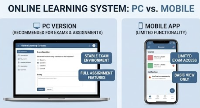 - 사실: 모바일 앱은 이동 중 간편하게 강의를 시청하거나 공지사항을 확인하는 데 유용하지만, 복잡한 과제 작성, 온라인 시험 응시, 또는 긴 문서 열람 등은 PC 버전이 훨씬 안정적이고 편리합니다. 특히 시험 중 발생할 수 있는 오류를 최소화하기 위해서는 PC 버전을 사용하는 것이 권장됩니다.