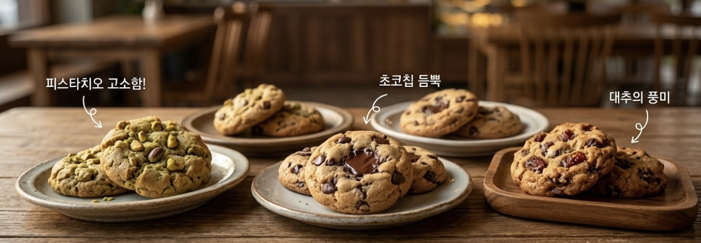 - 미식 경험의 확장 일반적인 베이커리에서는 쉽게 접하기 어려운 독특한 재료와 레시피로 만들어진 쿠키들을 한눈에 탐색하고 맛볼 수 있습니다. 전 세계의 쫀득한 쿠키 문화를 집에서 편안하게 경험할 수 있도록 돕습니다.