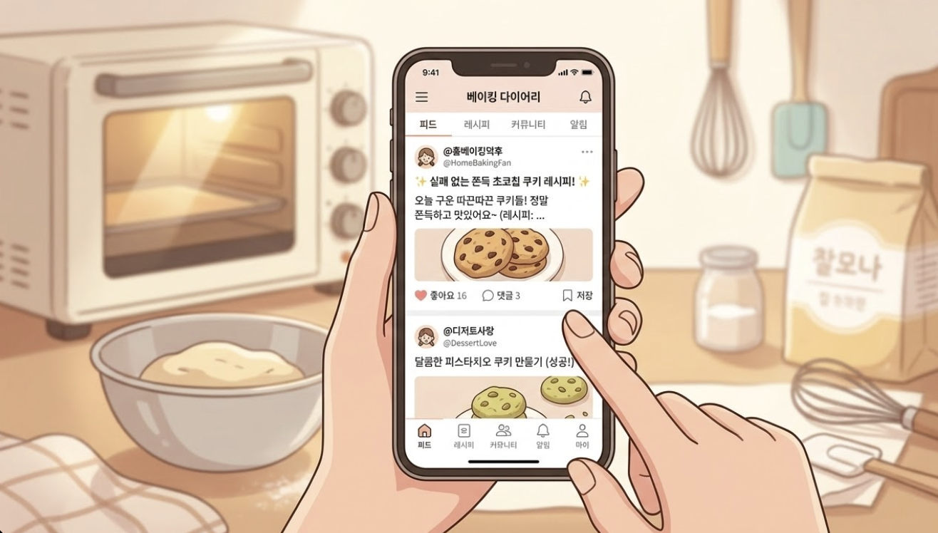 - 창작 레시피 공유 자신이 개발한 특별한 쫀득쿠키 레시피를 어플 커뮤니티에 공유하고, 다른 사용자들의 피드백을 받아보세요. 이는 베이킹 실력을 향상시키고, 같은 취미를 가진 사람들과 교류하는 좋은 기회가 됩니다.
