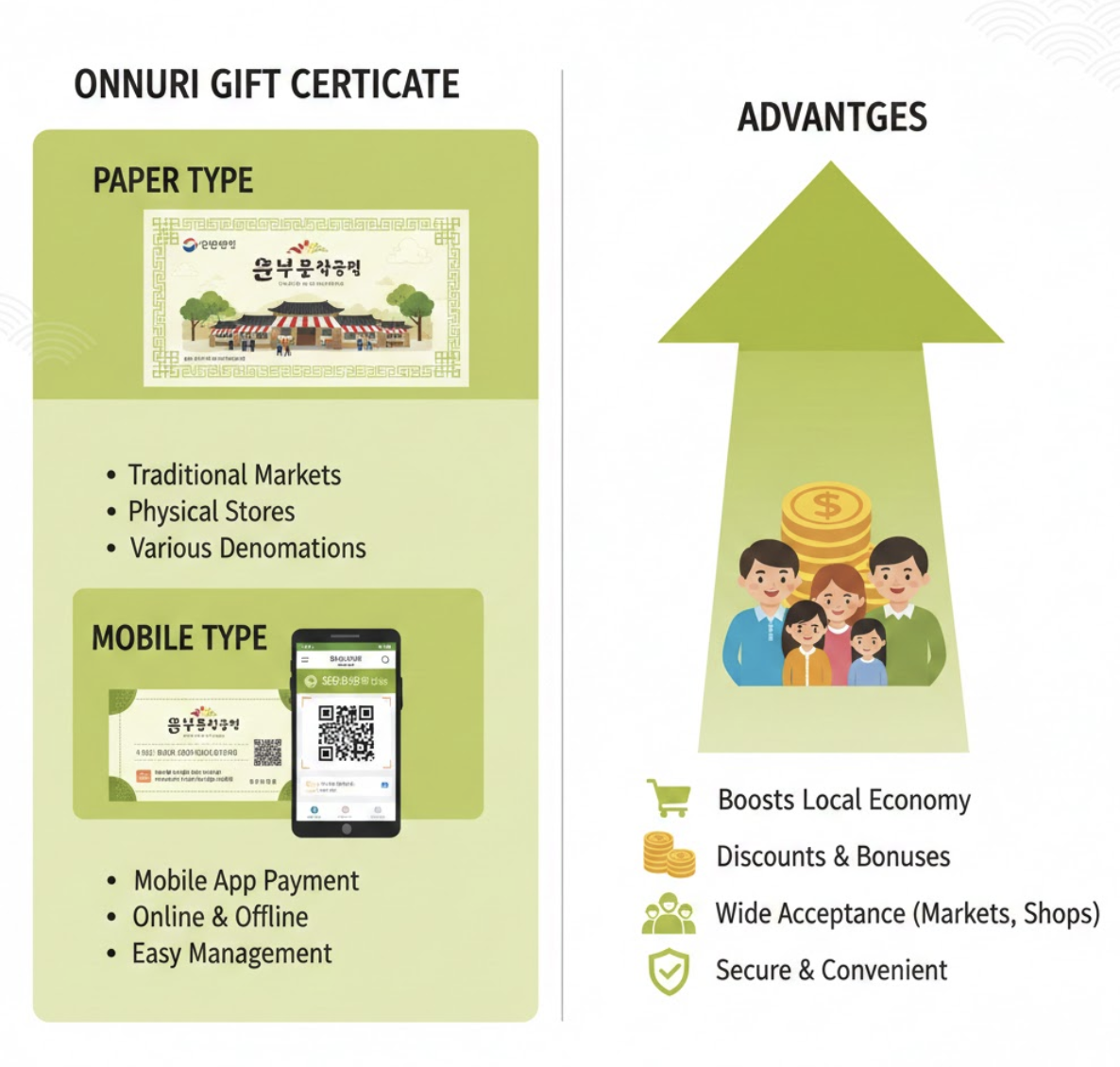 - 지역 경제 활성화 기여: 전통시장 가맹점에서 사용되는 온누리 상품권은 지역 경제 활성화에 기여합니다.