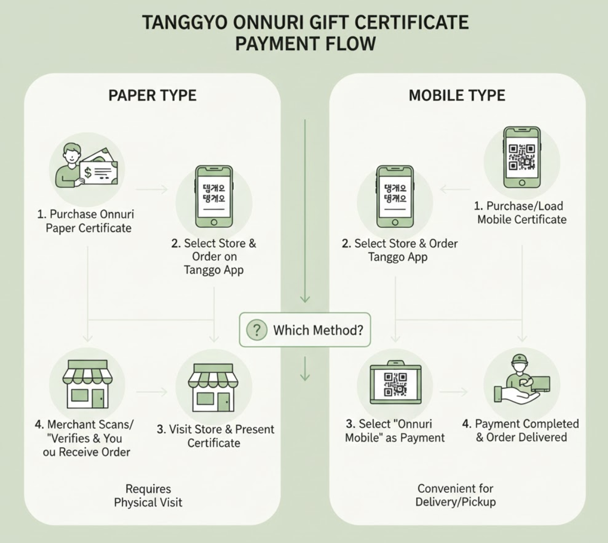 땡겨요에서 온누리 상품권을 결제하는 방법은 크게 두 가지로 나뉩니다. 바로 ‘지류 온누리 상품권’과 ‘모바일 온누리 상품권’입니다. 각각의 결제 방법을 자세히 알아보겠습니다.