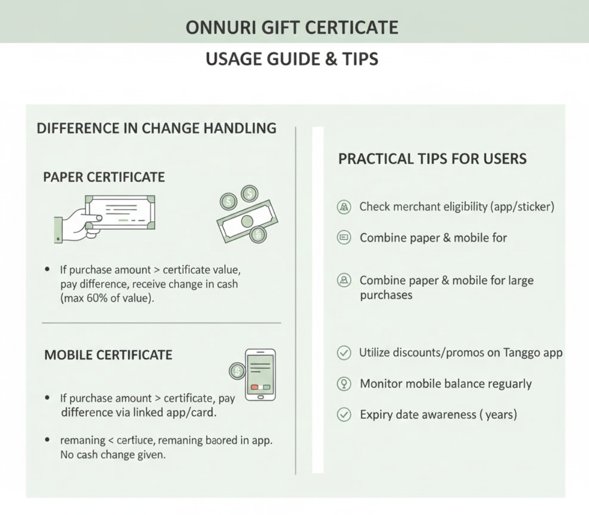 - 지류 온누리 상품권 결제 시, 차액 처리 방식을 미리 문의합니다.