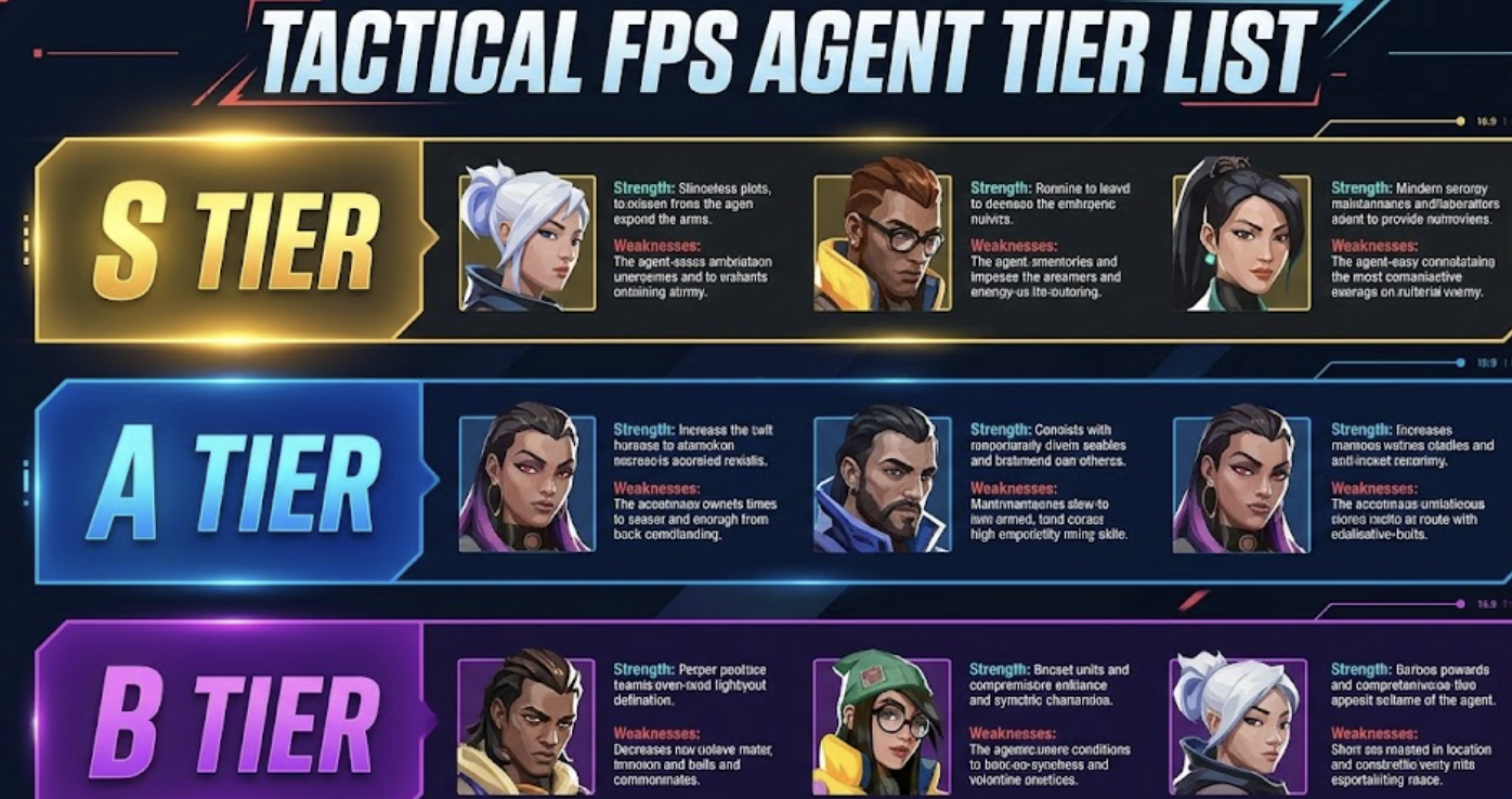 - 티어 정보 확인 Tracker.gg나 발로란트 관련 커뮤니티, 프로 경기 분석 등을 통해 현재 메타 요원 티어를 확인할 수 있습니다.