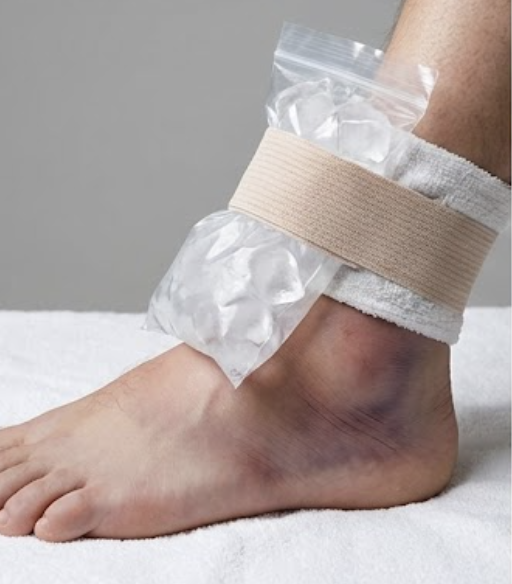 - E (Elevation) 거상: 손상된 발목을 심장보다 높게 들어 올려 붓기를 가라앉힙니다.