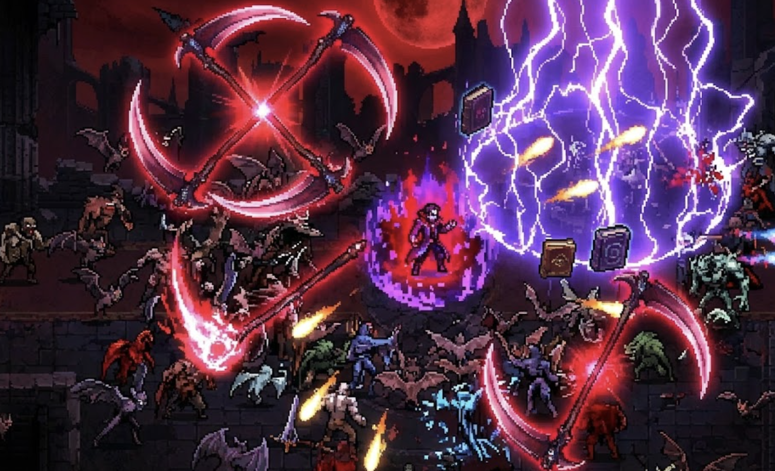 마법 지팡이는 가장 가까운 적을 자동으로 공격하며, 성스러운 지팡이로 진화하면 발사체가 더 강력해지고 적중 시 폭발합니다.도끼 + 촛대 = 죽음의 나선