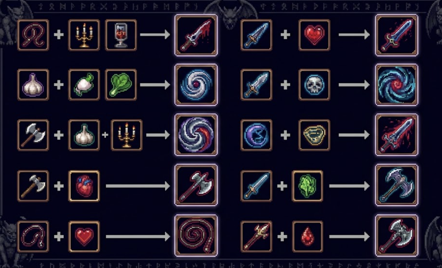 이 표는 가장 기본적인 무기 진화 조합의 몇 가지 예시를 보여줍니다. 게임 내에는 훨씬 더 많은 조합이 존재하며, 각 조합마다 독특한 효과와 플레이 스타일을 제공합니다.