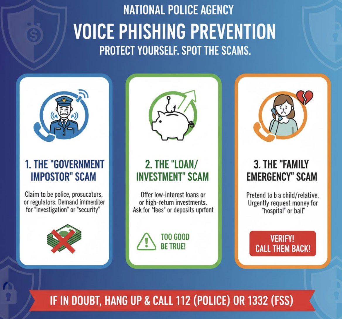 - 대처: 대한민국 수사기관은 절대 전화로 돈을 요구하거나 금융 정보를 묻지 않습니다. 전화를 끊고 112에 직접 전화하여 확인하세요.