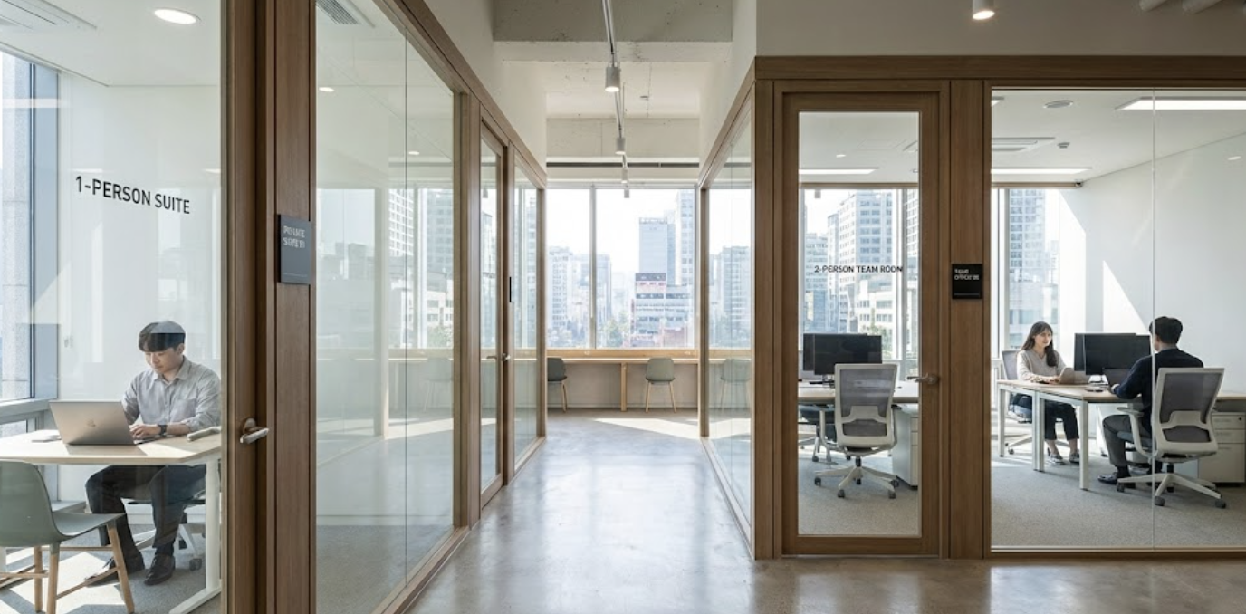 2인실은 두 명이 함께 사용할 수 있는 독립된 공간입니다. 동업자, 공동 창업자, 또는 소규모 팀원 두 명이 함께 일하기에 적합합니다.