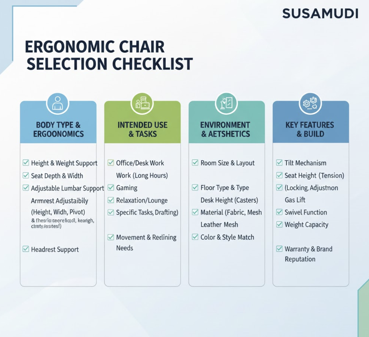 의자를 선택할 때는 다음과 같은 요소들을 종합적으로 고려해야 합니다.