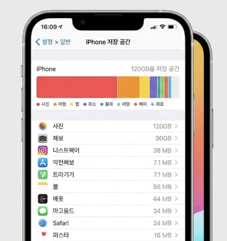 이 화면을 통해 어떤 앱이나 파일이 저장 공간을 가장 많이 차지하고 있는지 한눈에 파악할 수 있습니다. 특히 ‘시스템 데이터’나 ‘기타’ 항목이 비정상적으로 높게 표시되는 경우도 있는데, 이는 임시 파일이나 캐시 데이터가 쌓여 발생할 수 있습니다.