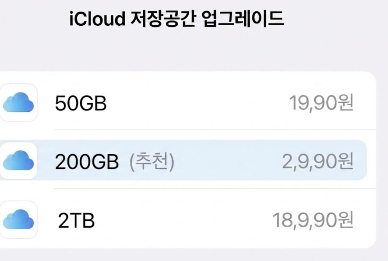 용량월 요금 (대한민국 기준)주요 활용50GB1,100원사진, 백업 등 개인 사용200GB3,300원가족 공유, 많은 사진 및 파일2TB11,100원대용량 파일, 여러 기기 백업, 전문가용