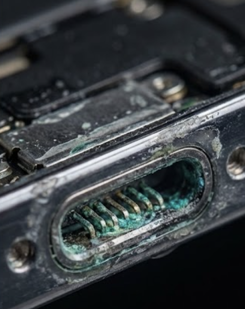 물기가 포트 내부로 들어가면 핀들 사이에 물이 고여 합선을 일으킬 수 있습니다. 시간이 지나면 물은 핀과 주변 금속 부품을 부식시키기 시작합니다. 부식은 단자의 전도성을 떨어뜨려 충전 불량이나 데이터 전송 오류를 일으키고, 심할 경우 메인보드까지 손상시킬 수 있습니다. 한 번 부식이 시작되면 자연적으로 해결되기 어렵고, 전문적인 세척 및 수리가 필요합니다.
