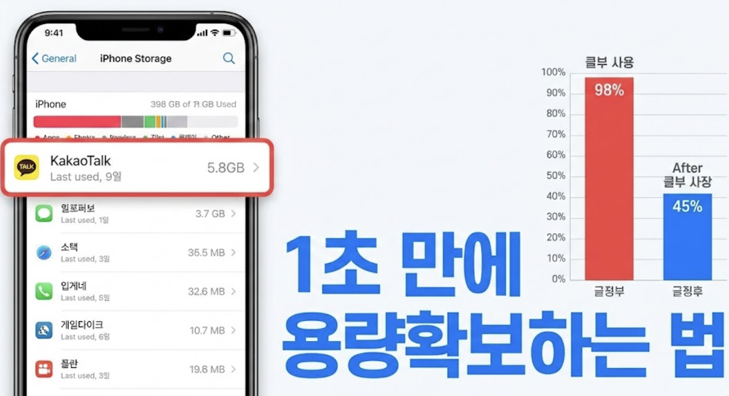 - 아이폰 저장 공간 관리 아이폰은 안드로이드에 비해 외부 저장 공간 확장 옵션이 없으므로, 카카오톡을 통해 주고받는 미디어 파일이 저장 공간을 많이 차지할 수 있습니다. 불필요한 사진이나 동영상은 주기적으로 삭제하거나 iCloud 또는 다른 클라우드 서비스에 백업하여 공간을 확보하는 것이 중요합니다.