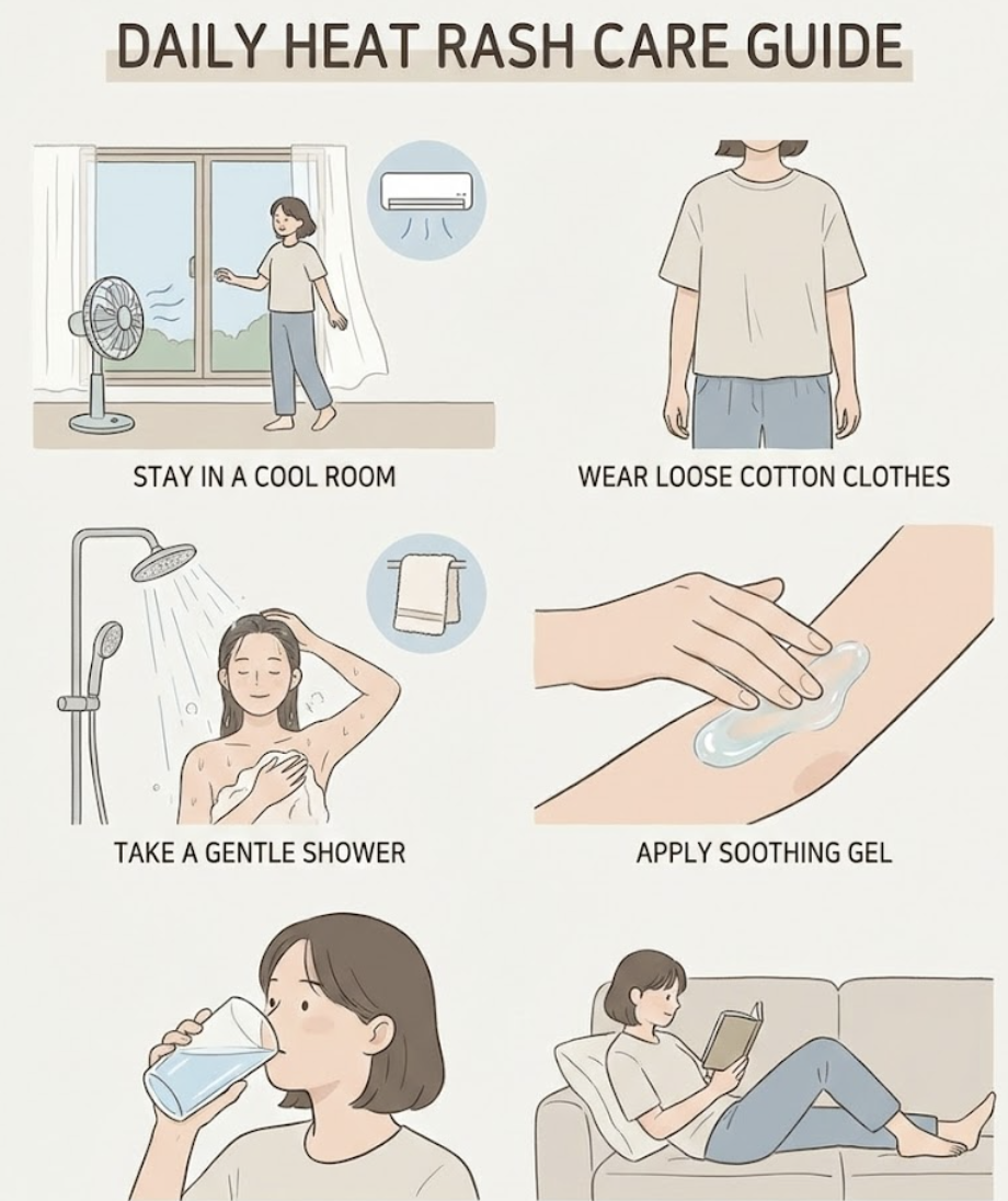 | 수분 섭취 | 탈수 방지를 위해 물이나 전해질 음료 충분히 섭취 | 체내 수분 유지로 피부 열감을 빠르게 배출 |