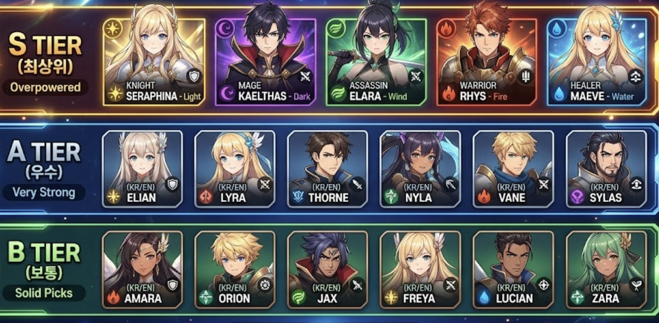 - 캐릭터 티어: 특정 캐릭터의 성능, 활용도, 성장 잠재력 등을 기준으로 순위를 매깁니다.