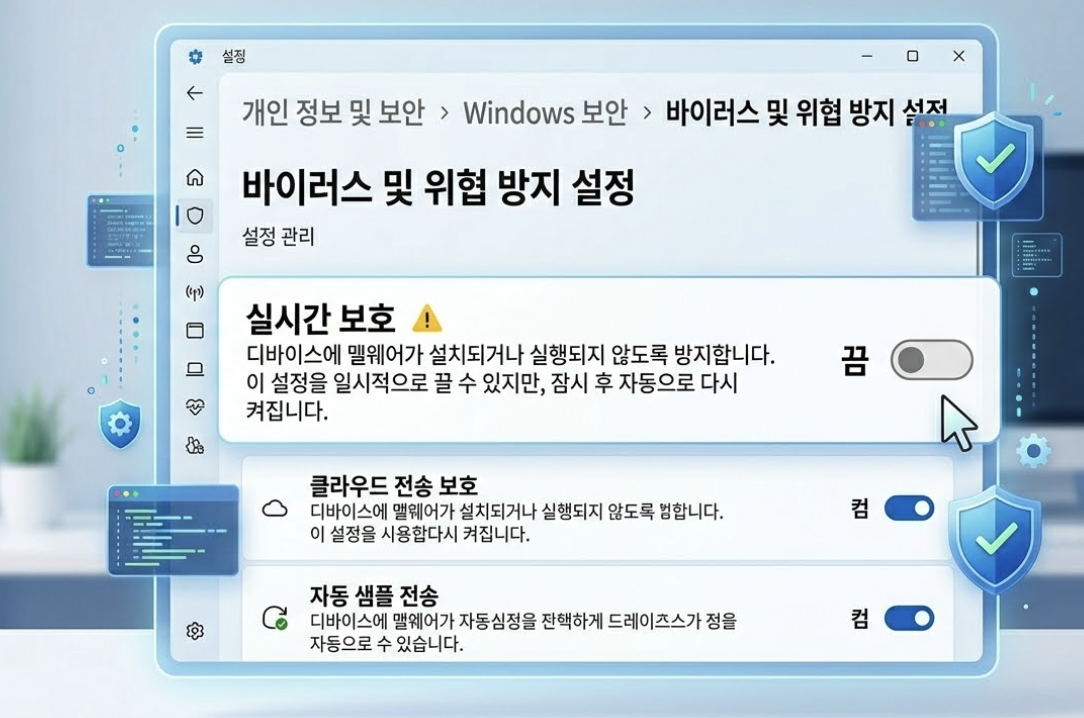- ‘실시간 보호’ 토글을 ‘끔’으로 변경합니다. 사용자 계정 컨트롤(UAC) 메시지가 나타나면 ‘예’를 클릭합니다.