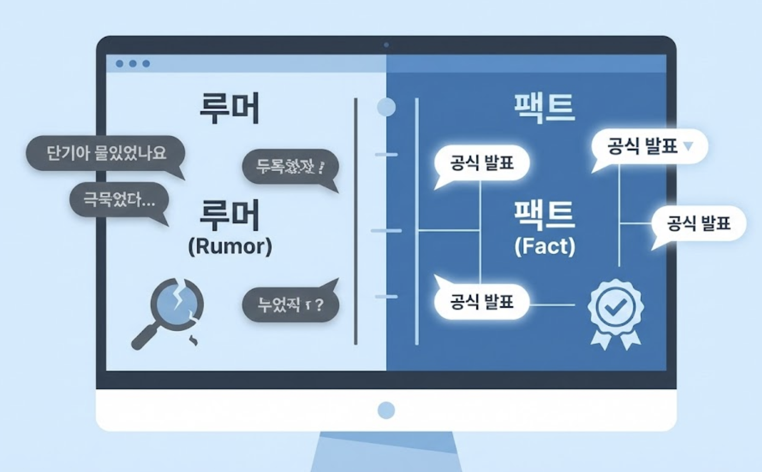 - 루머: 대부분 익명성이 보장되는 온라인 커뮤니티나 SNS를 통해 확산되며, 구체적인 출처나 증거 없이 ‘들었다’거나 ‘봤다’는 식의 주장이 많습니다. 사실 확인이 어렵고, 내용이 계속 변형되거나 과장될 수 있습니다.