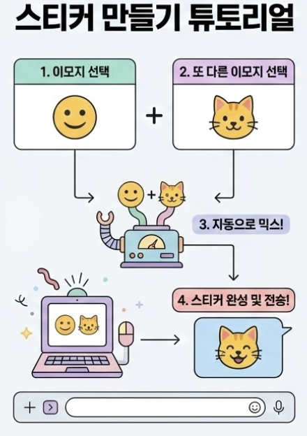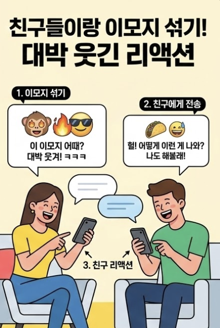 기존 이모티콘으로는 표현하기 부족했던 나만의 독특한 감정이나 유머를 합쳐진 이모티콘으로 완벽하게 전달할 수 있습니다. 예를 들어, ‘웃는 얼굴’과 ‘하트 눈’을 합쳐 매우 행복한 감정을 표현하거나, ‘놀란 얼굴’과 ‘땀방울’을 합쳐 당황스러움을 강조할 수 있습니다.풍부한 감정 전달