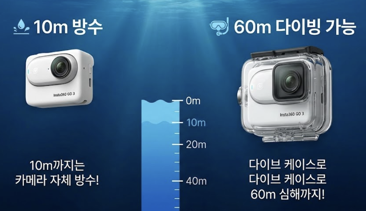 - 인스타360 에이스프로는 카메라 본체만으로 10m 수심까지 방수를 지원합니다. 더 깊은 수심(최대 60m)에서의 다이빙 촬영을 위해서는 전용 다이브 케이스를 반드시 사용해야 합니다.