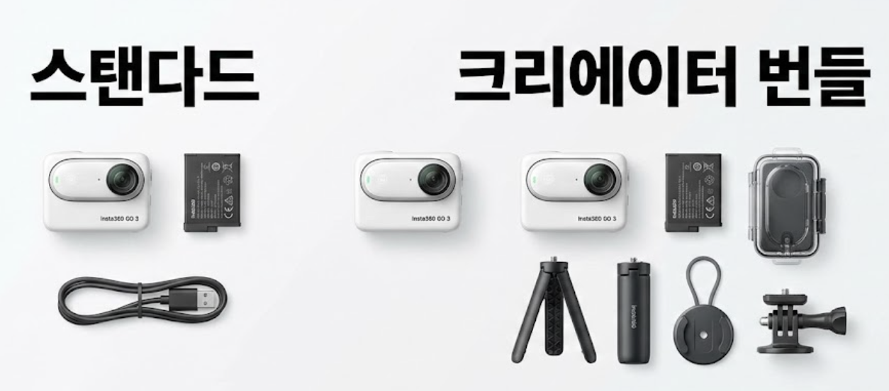 - 크리에이터 번들 스탠다드 번들에 셀카봉, 미니 삼각대, 추가 배터리 등 브이로그나 콘텐츠 제작에 유용한 액세서리가 추가됩니다. 다양한 앵글과 장시간 촬영을 원하는 분들에게 추천합니다.