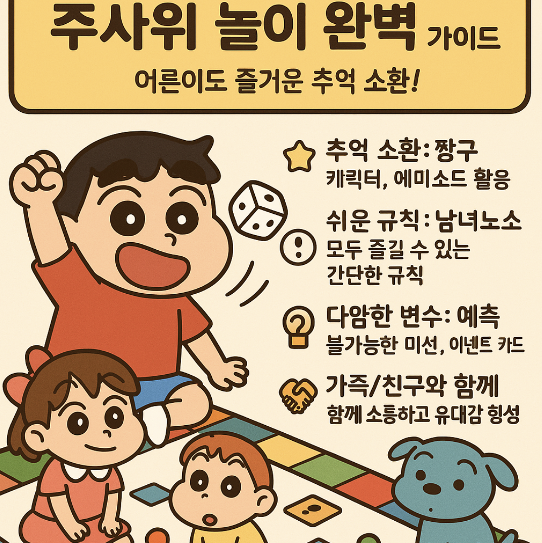 어린 시절 TV 앞에서 짱구를 보며 깔깔 웃었던 기억, 다들 있으시죠? 엉뚱하고 귀여운 짱구가 등장하는 주사위 놀이는 단순한 보드게임을 넘어, 어릴 적 추억을 되살려주는 특별한 경험을 선사합니다. 이 가이드에서는 짱구는 못말려 주사위 놀이의 매력부터 실생활 활용법, 그리고 더욱 재미있게 즐기는 팁까지 꼼꼼하게 알려드릴게요.