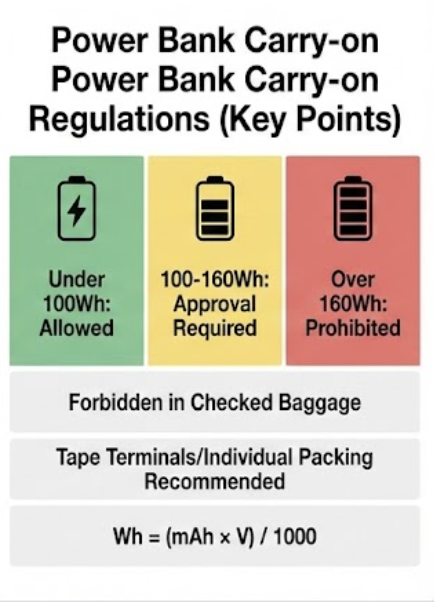 배터리 용량 (Wh)배터리 용량 (mAh, 3.7V 기준)휴대 가능 여부개수 제한비고100Wh 이하약 27,000mAh 이하기내 휴대 가능1인당 2개까지별도 승인 불필요100Wh 초과 ~ 160Wh 이하약 27,000mAh 초과 ~ 43,243mAh 이하항공사 승인 후 기내 휴대 가능1인당 2개까지사전 승인 필수160Wh 초과약 43,243mAh 초과휴대 불가-위탁/기내 모두 불가