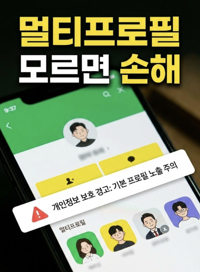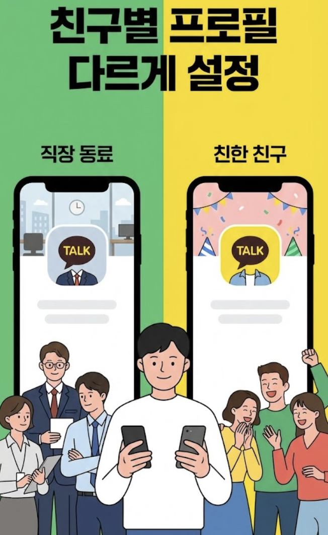 A: 아닙니다. 멀티프로필에 설정하는 이름(예: ‘직장용’, ‘친구용’)은 오직 나 자신만 볼 수 있는 관리용 이름입니다. 친구들에게는 해당 프로필의 사진, 상태 메시지, 배경 등만 보여집니다.