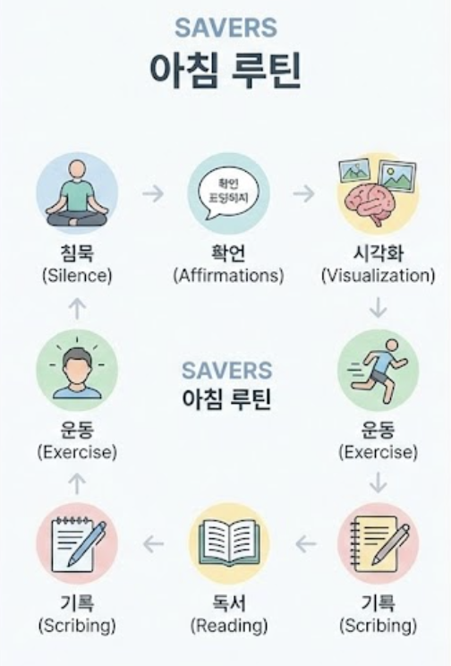 할 엘로드 작가는 미라클 모닝의 핵심 활동으로 SAVERS라는 6가지 습관을 제시합니다. 이 활동들은 개인의 성장과 발전에 필수적인 요소들로 구성되어 있으며, 각자의 상황에 맞춰 유연하게 적용할 수 있습니다.