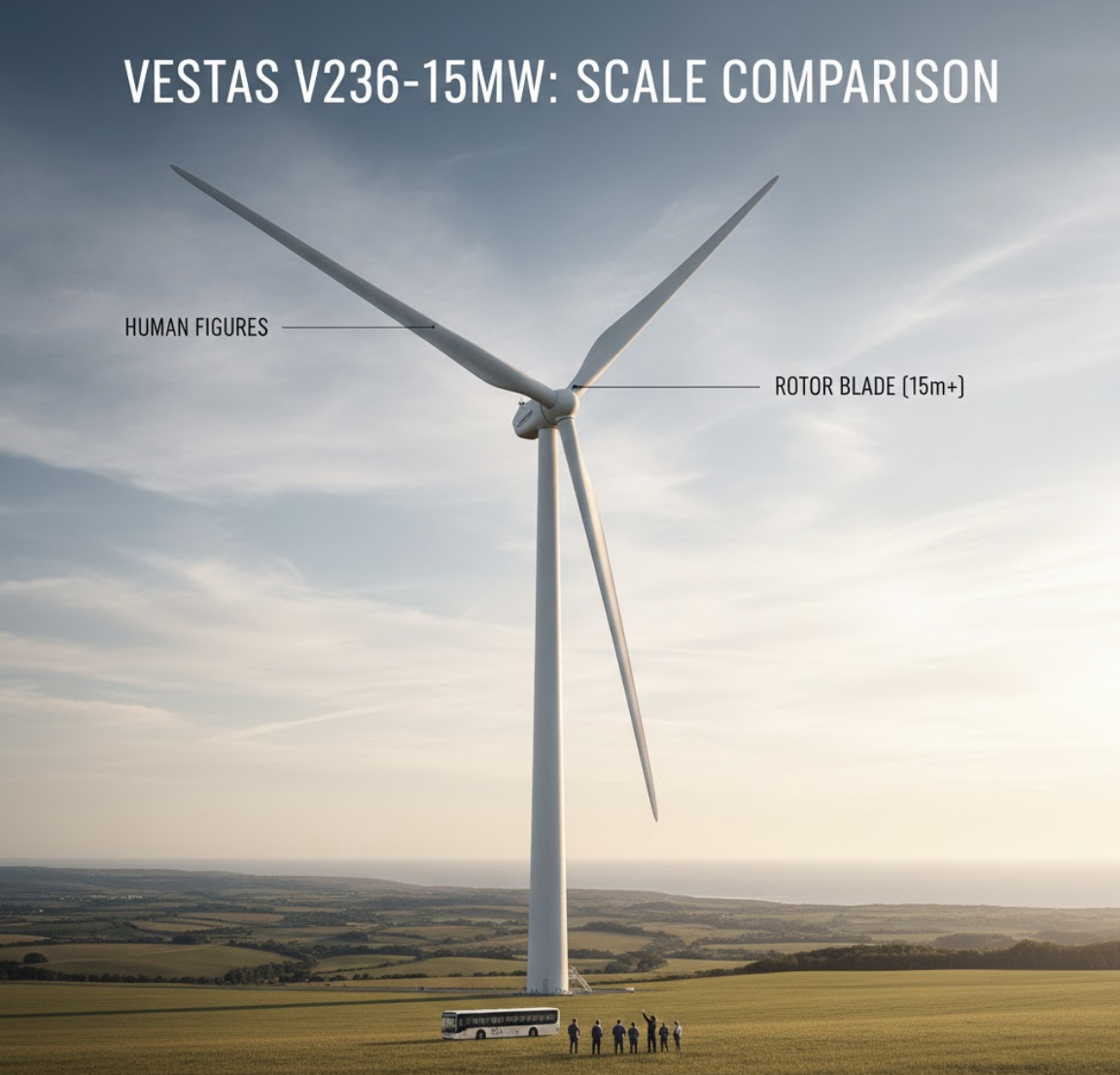 - 15MW급 터빈: 날개 길이 약 110~120m 이상. (현존하는 초대형 해상풍력의 표준으로 진화 중)