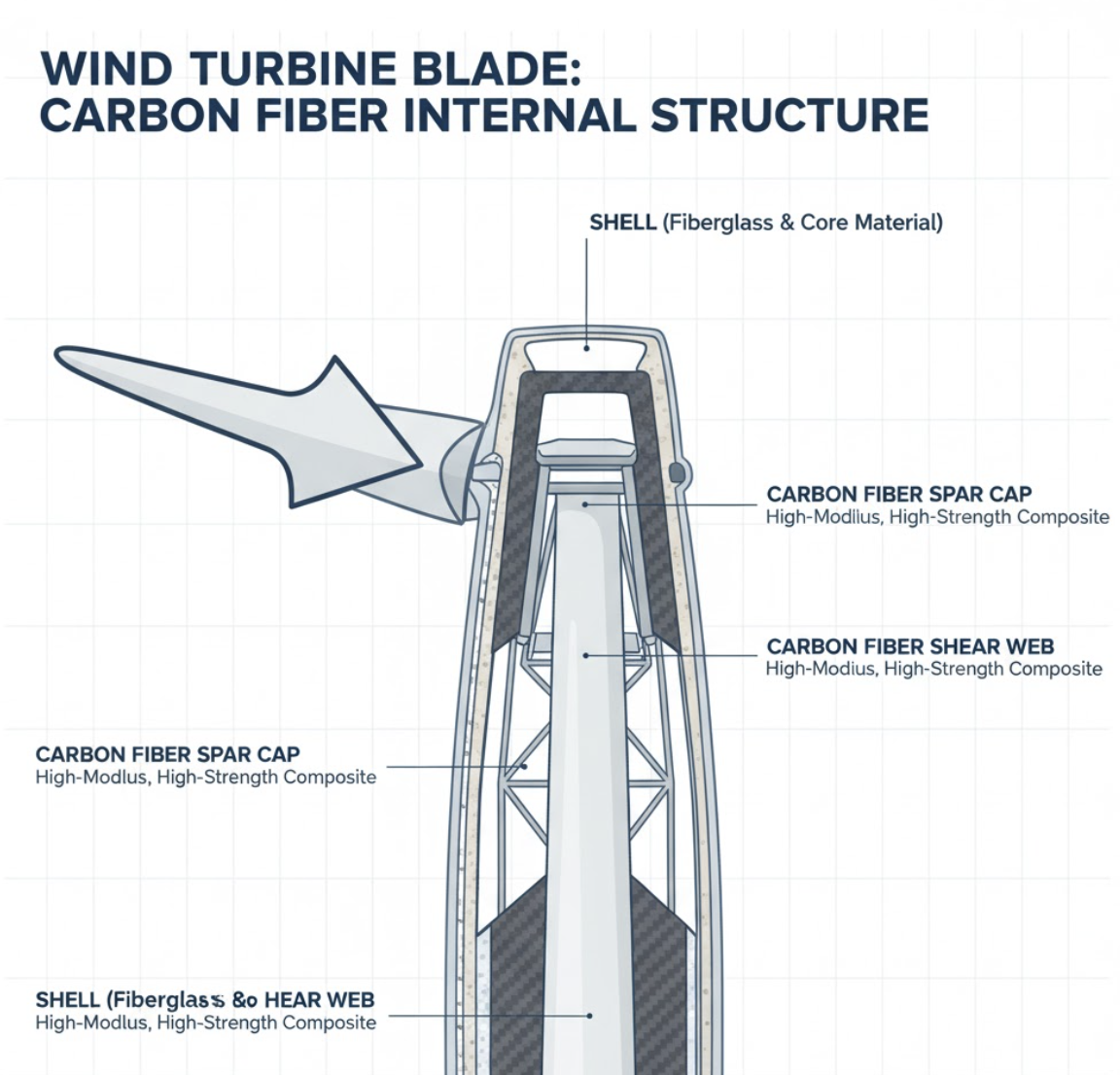 기존의 유리 섬유 강화 플라스틱(GFRP)으로는 초대형 블레이드의 무게와 강성을 모두 잡기 어렵습니다.