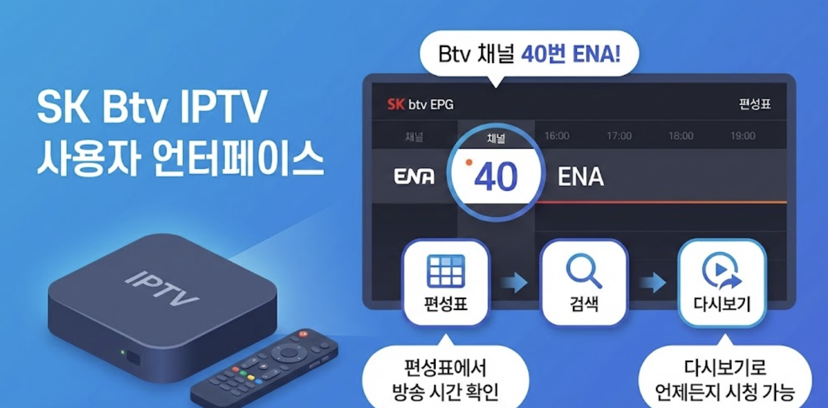 IPTV나 디지털 케이블 TV 셋톱박스 메뉴에서 ‘편성표’ 또는 ‘EPG(Electronic Program Guide)’ 기능을 활용하면 TV 화면에서 직접 ENA의 편성표를 확인할 수 있습니다. 리모컨으로 쉽게 조작할 수 있어 직관적입니다.
