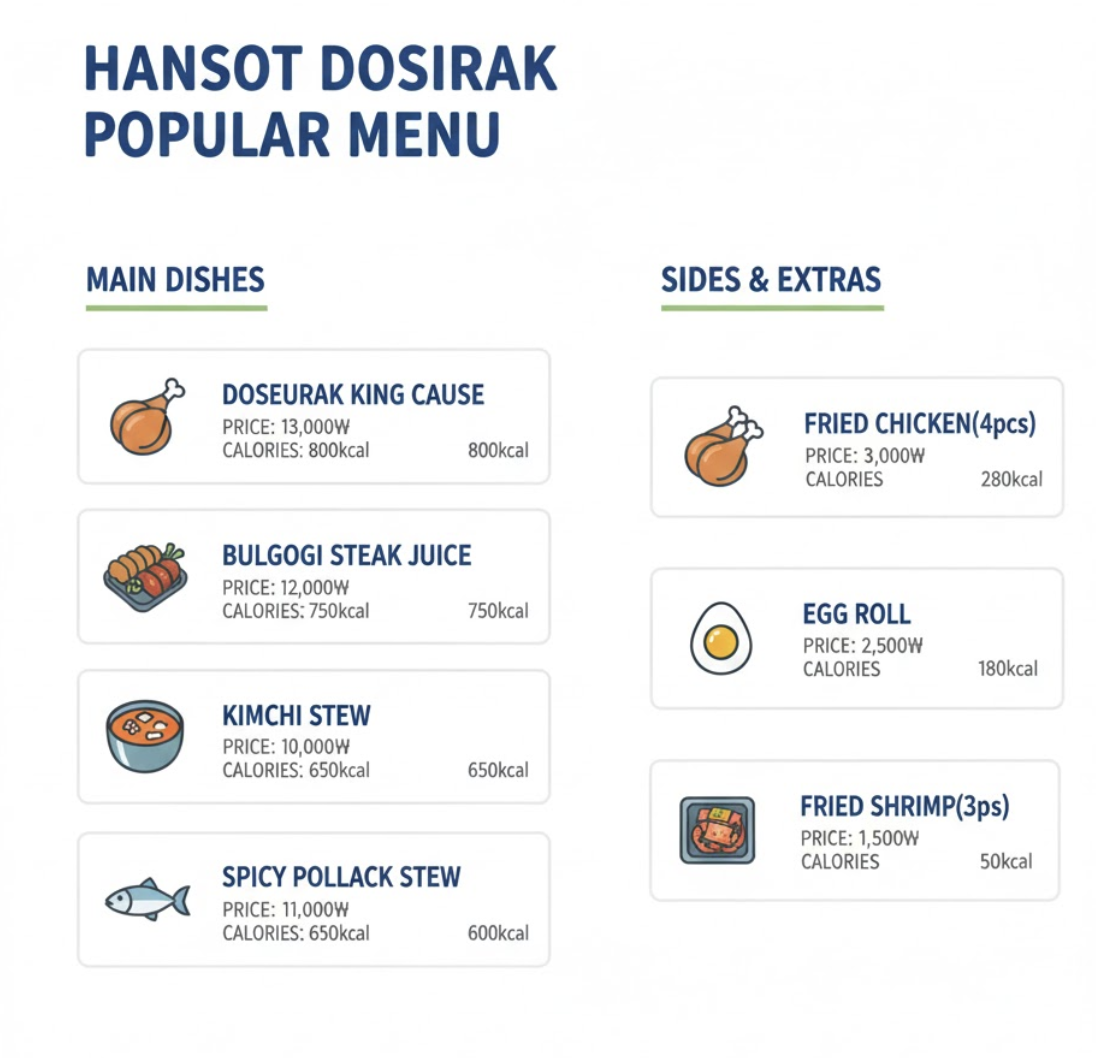 - 실속/간편 도시락: 가성비를 중요하게 생각하는 분들을 위한 메뉴입니다. 부담 없는 가격으로 든든함을 채울 수 있습니다.