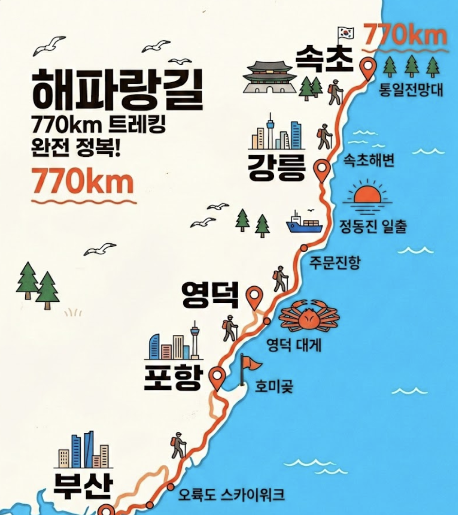 해파랑길은 단순히 걷는 것을 넘어, 각 지역의 문화와 역사를 체험하고 신선한 해산물 요리를 맛보며 몸과 마음의 힐링을 얻을 수 있는 특별한 여정입니다. 바쁜 일상에서 벗어나 자연 속에서 자신을 돌아보고 싶은 분들, 새로운 도전을 꿈꾸는 모든 분들에게 해파랑길은 최고의 선택이 될 것입니다.