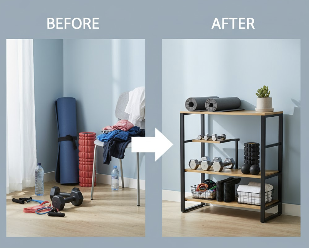 • 전면 랙 시스템: 깔끔한 디자인의 철제 랙(정리대)을 설치하고, 각 층을 테마별로 정리합니다. (예: 1층 중량/ 2층 폼롤러/ 3층 수건&물통)
