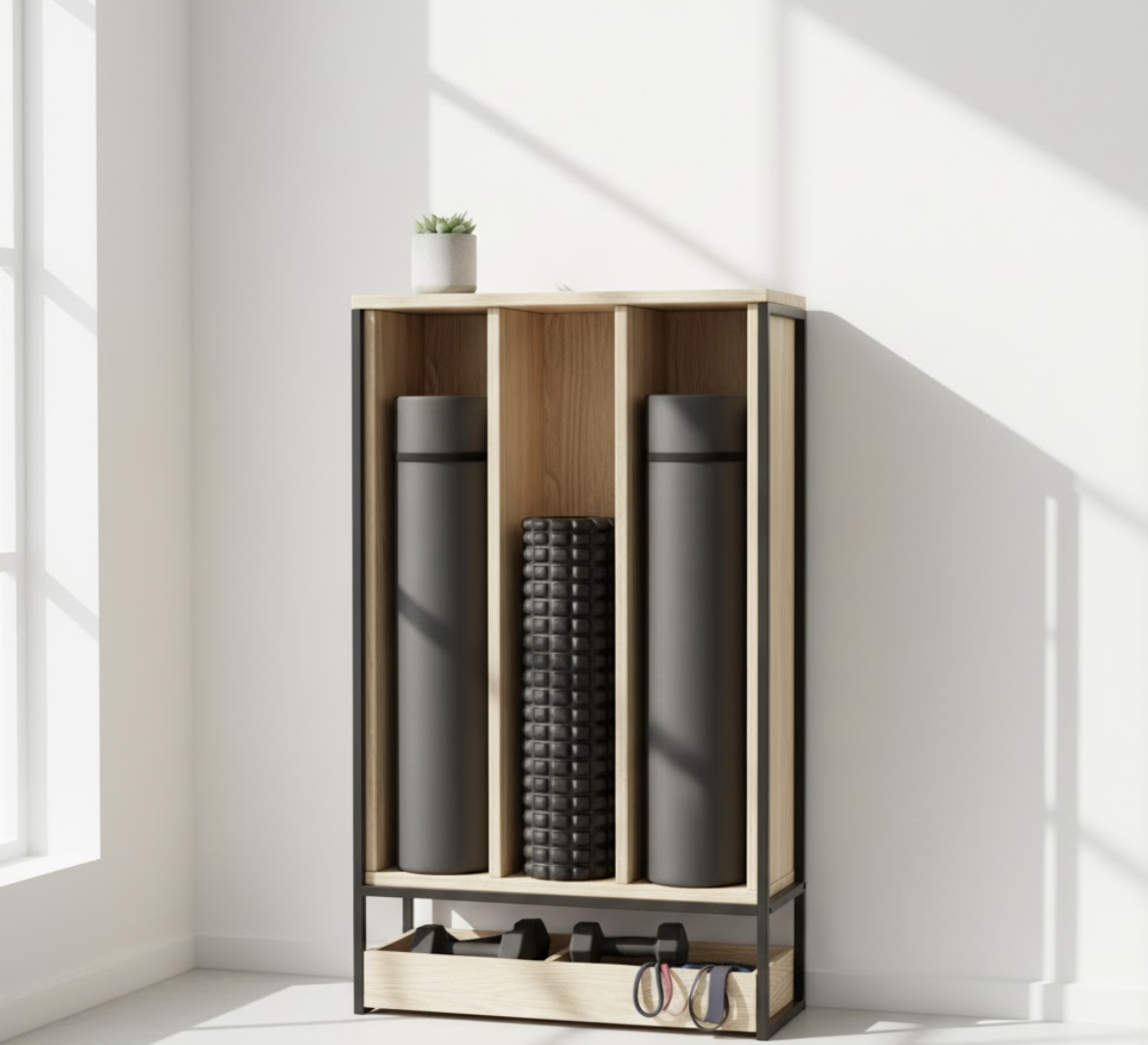 • DIY 커스텀 선반: 모듈형 선반(ex. 이케아 KALLAX 또는 철제 앵글 선반)을 활용하여 요가 매트 거치대, 덤벨 수납칸, 작은 상자 수납칸 등을 직접 설계하여 자신만의 홈트 기구 정리대를 만들 수 있습니다.