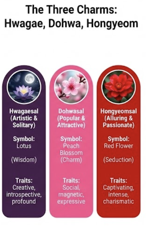 화개살, 도화살, 홍염살은 모두 개인의 매력이나 특정 기운과 관련이 있지만, 그 발현 양상과 특징에서 차이가 있습니다. 이 세 가지 살을 함께 이해하는 것이 중요합니다.