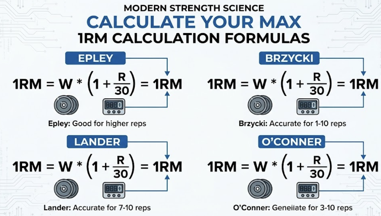 다양한 1RM 계산 공식들이 존재하며, 각 공식은 약간씩 다른 방식으로 1RM을 추정합니다. 가장 널리 사용되는 공식들은 다음과 같습니다.