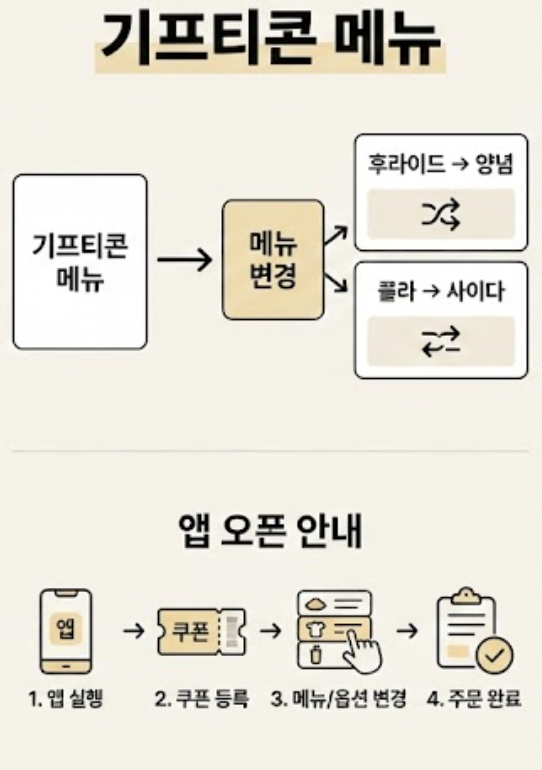 - 기프티콘 금액만큼 다른 메뉴 주문: 간혹 기프티콘을 ‘현금성 상품권’처럼 취급하여, 기프티콘 금액 내에서 자유롭게 다른 메뉴를 선택할 수 있도록 하는 매장도 있습니다. 이 경우에도 반드시 사전에 매장에 문의해야 합니다.