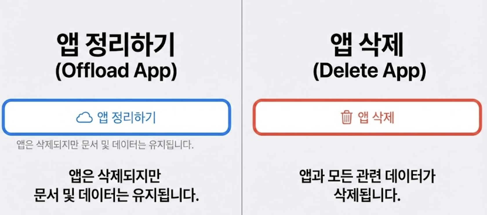 - ‘앱 정리하기’: 앱 자체는 삭제하지만, 문서 및 데이터는 기기에 유지됩니다. 이 옵션은 초기화가 되지 않으니 선택하지 마세요.