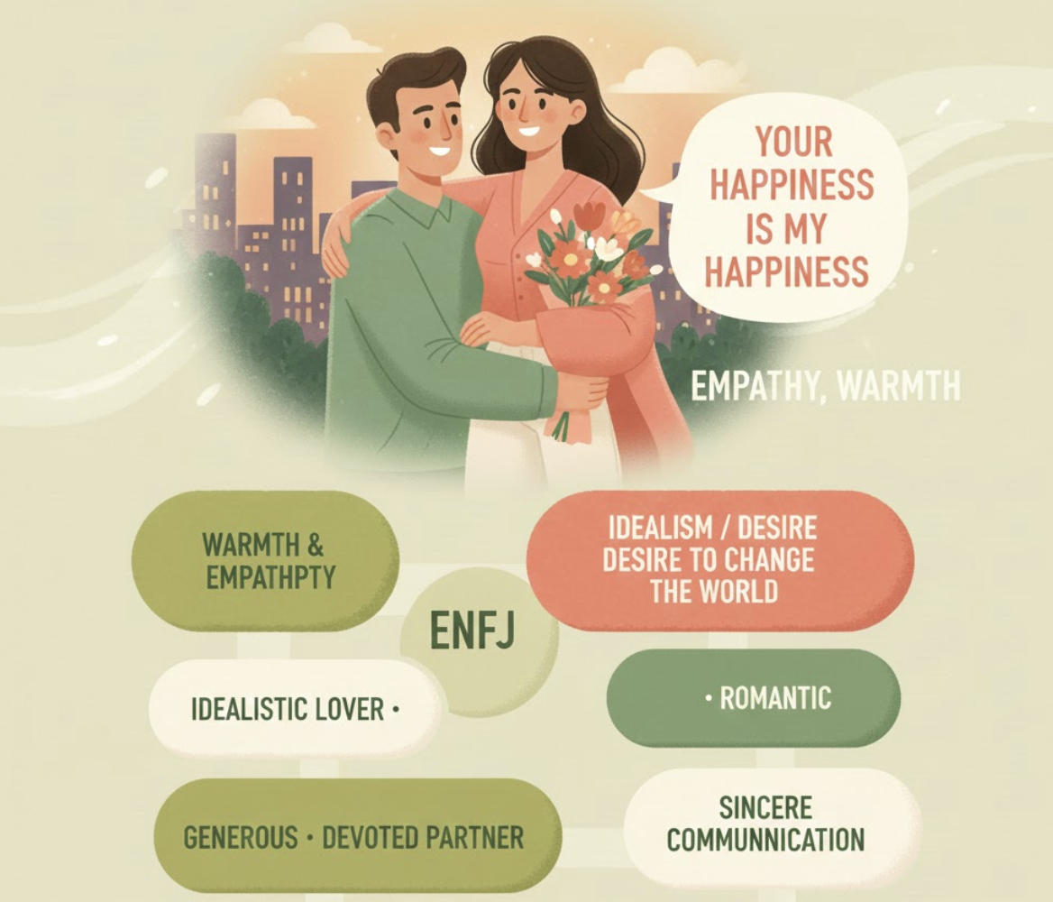 ENFJ는 파트너에게 헌신적이며, 아낌없이 사랑을 표현합니다. 상대방의 필요를 채워주고, 행복을 위해 기꺼이 희생합니다. 하지만 지나친 헌신은 자신을 소진하게 만들 수 있으므로, 자신의 감정과 필요를 돌보는 것도 잊지 않아야 합니다.